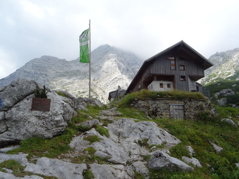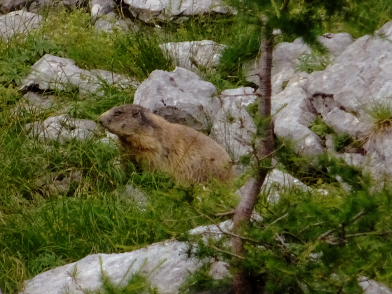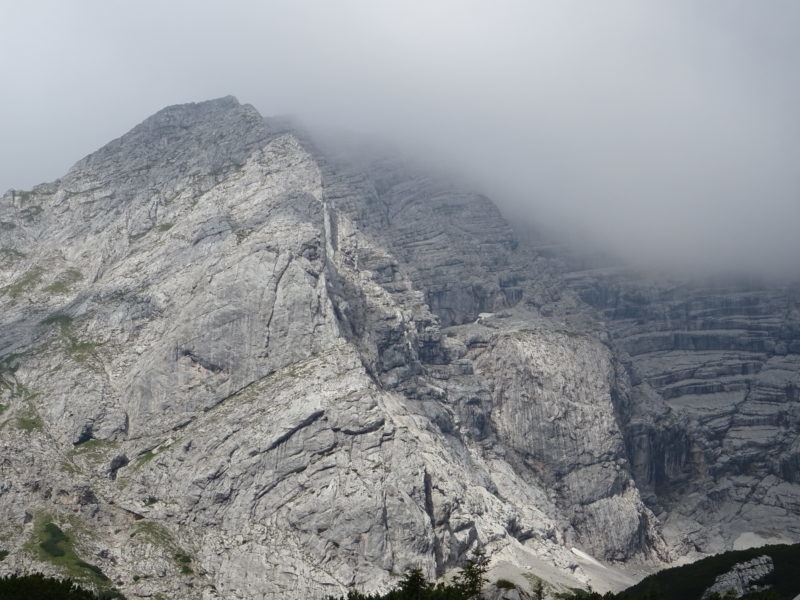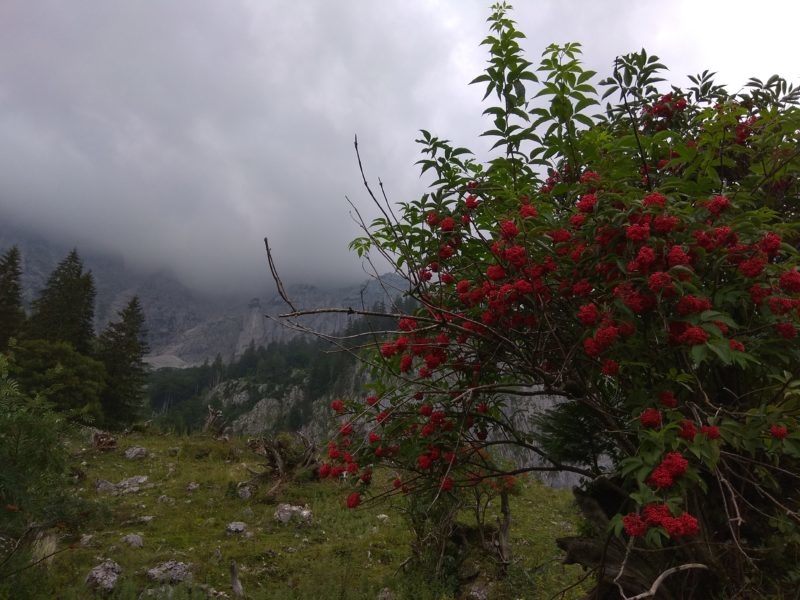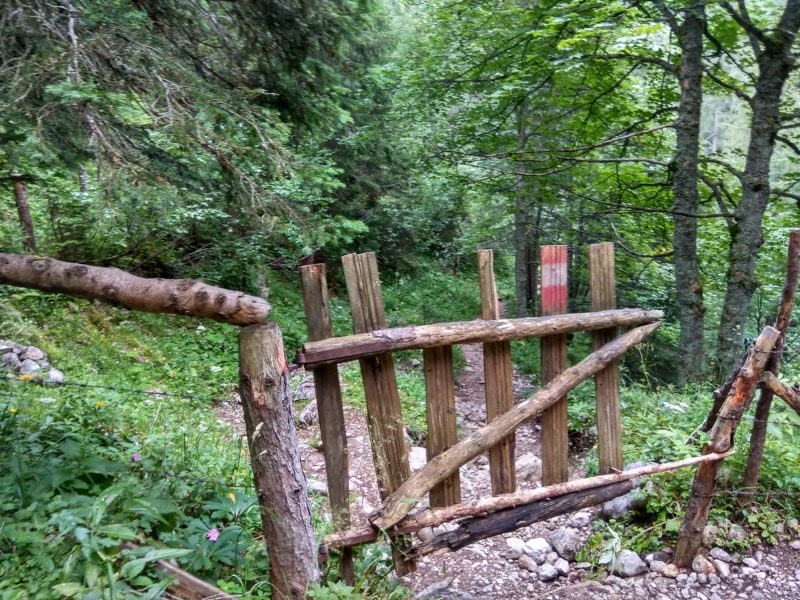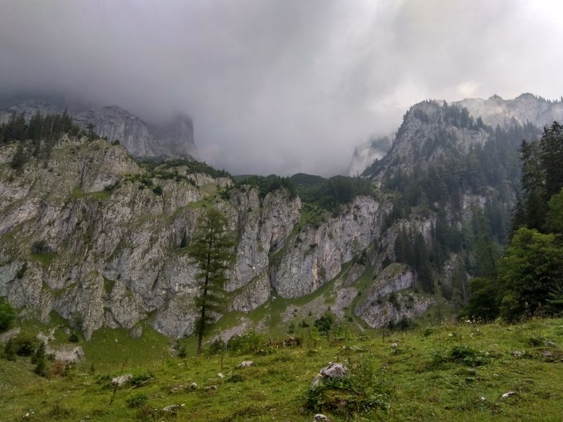 W tak pięknych okolicznościach przyrody docieramy do rozwidlenia szlaków. W lewo ferratowa droga Schneelochweg na wierzchołek Hochtora, w prawo szlak do schroniska Heshutte. Ślisko jest już tu w lesie, nadciągają złowrogie, czarne chmury, chwilami mży, więc bez zastanowienia skręcamy w prawo. Zapewne szlak jest bardzo widokowy, możemy to ocenić po ukształtowaniu terenu. Chwilami droga podchodzi zakosami zboczem szczytu znajdującego się naprzeciwko Hochtora, schodzi do przełączek, prowadzi przez liczne łąki, ale niestety mgła wszystko zasnuwa.