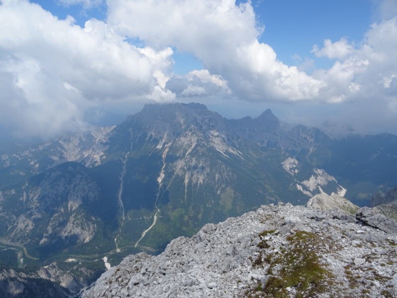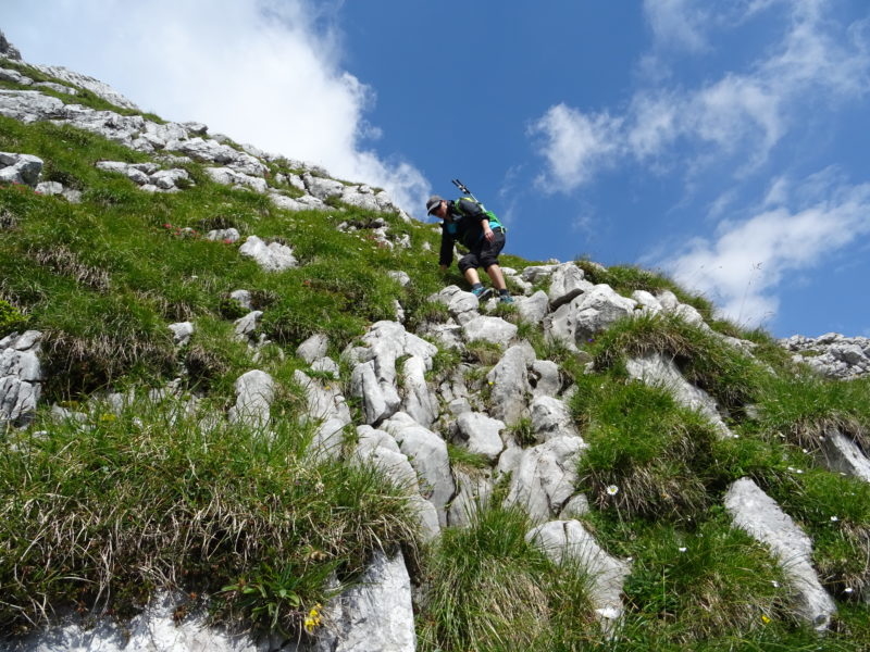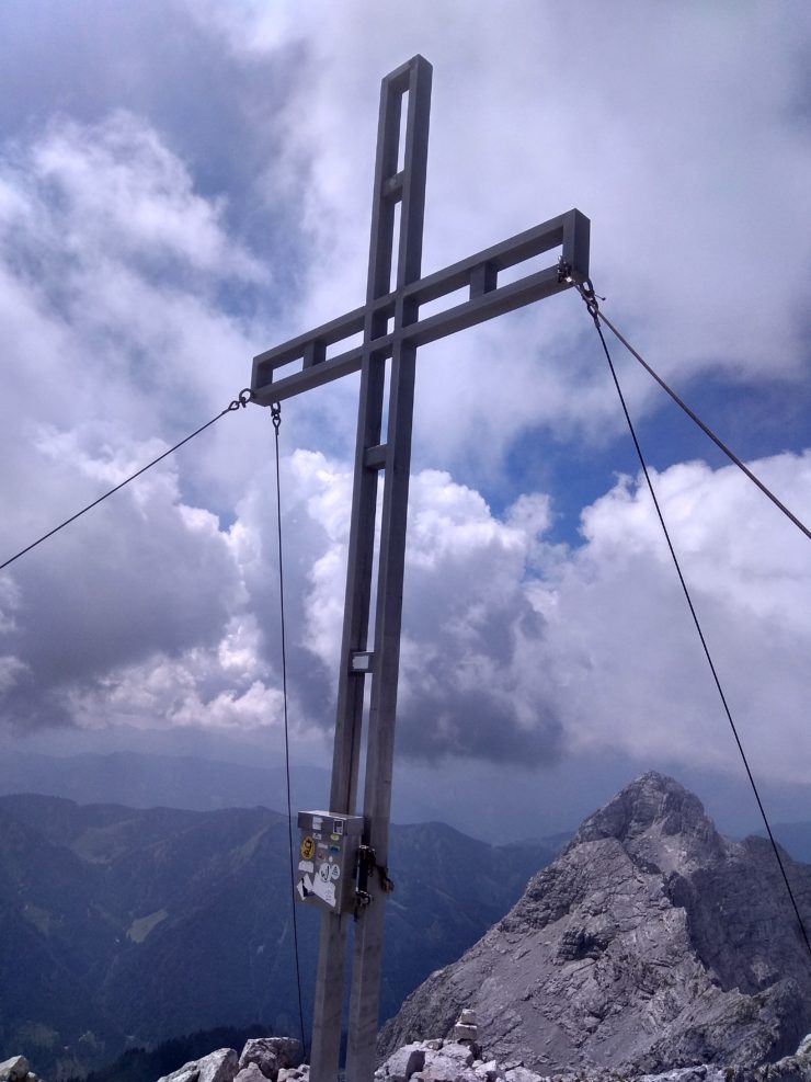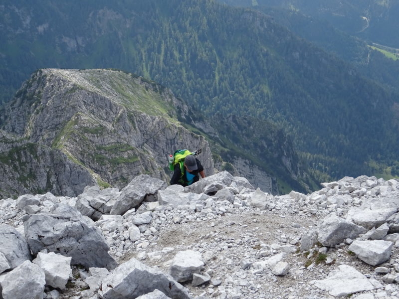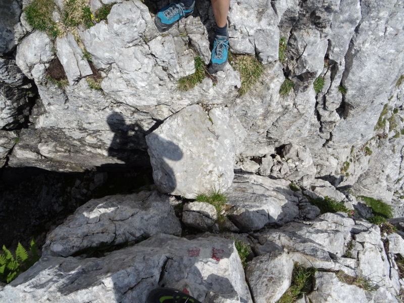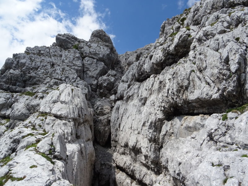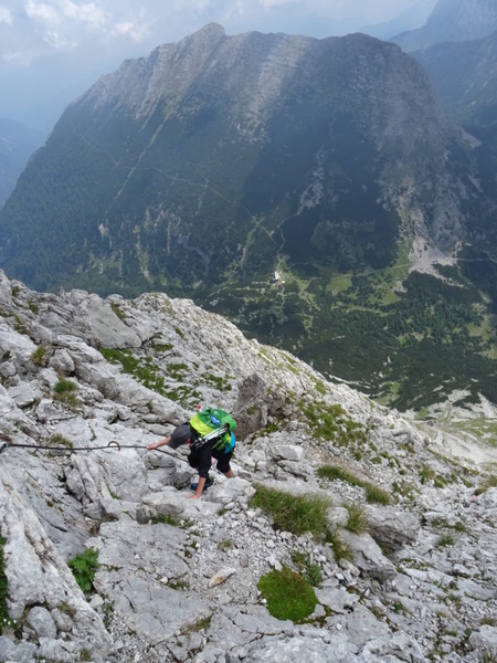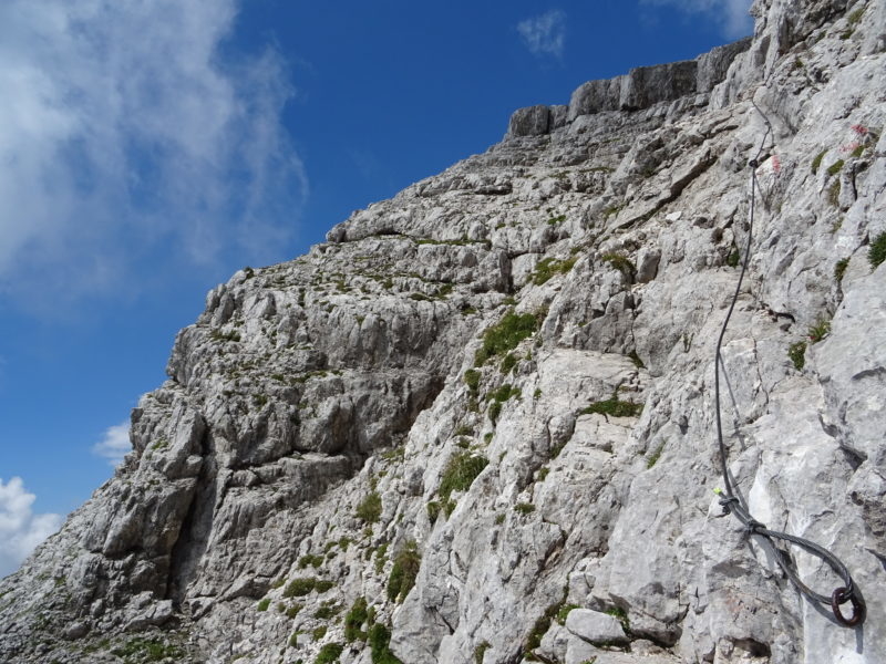 Idzie się dość przyjemnie ferratą o nazwie Josefinensteig, pierwotnie zakosami pionowymi, tylko na zakrętach dość szybko zdobywamy wysokość. Następnie dość długi trawers w kierunku północnym, by żebrem osiągnąć grań.