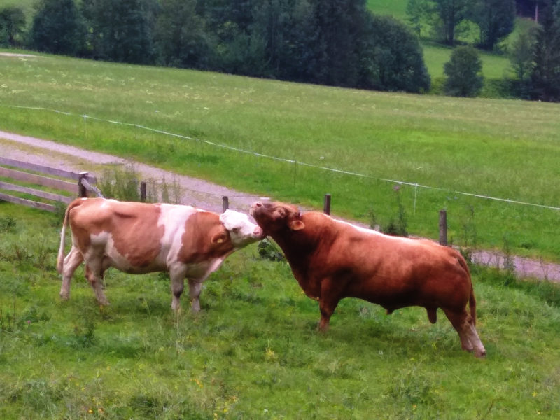 Jest godz. 7:15. Mijamy bardzo liczne w tej okolicy pastwiska z krowami, fantastyczne płoty i drewniane bramy z informacjami by nie podrywać mlecznych panienek i trzymać się od nich z dala. Niektóre bramy otwieramy i zamykamy za sobą. Mleczne panienki, widać na wydaniu, interesują się gośćmi, a i zagadują – sympatyczne towarzystwo umila nam wędrówkę.